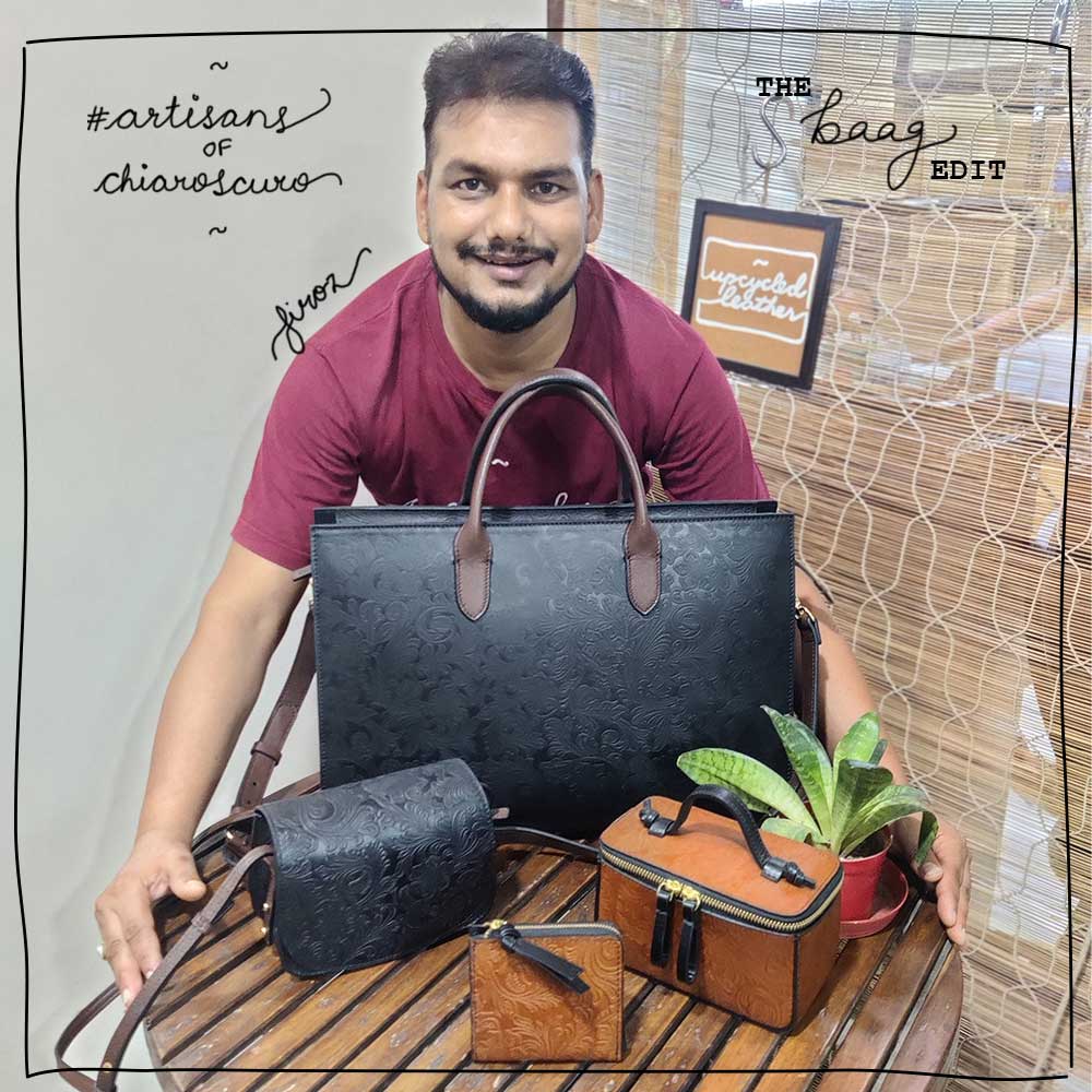 This edit was borne from upcycling a batch of tan nappa leather with the emboss texture.
